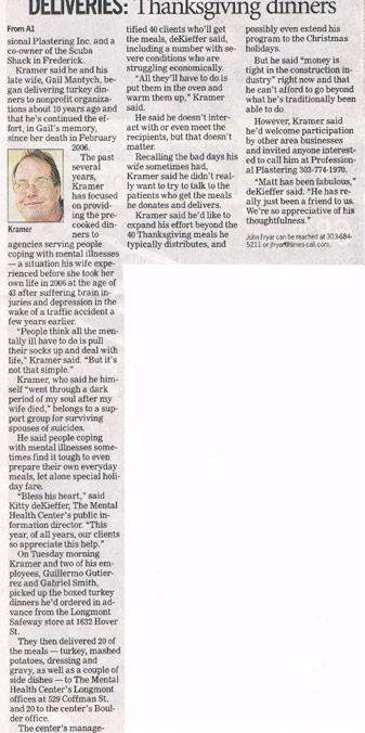 Professional Plastering is proud to donate money to the Boulder County Mental Health Center each year for Thanksgiving. Last year, we provided close to 1000 people with turkey dinners. Our aim is to promote suicide prevention in our community. Between 28 and 36 veterans commit suicide daily and suicide is the leading cause of death for young people worldwide. For a quarter of a century, we've done our part to make a difference. Reach out to us today for more information.